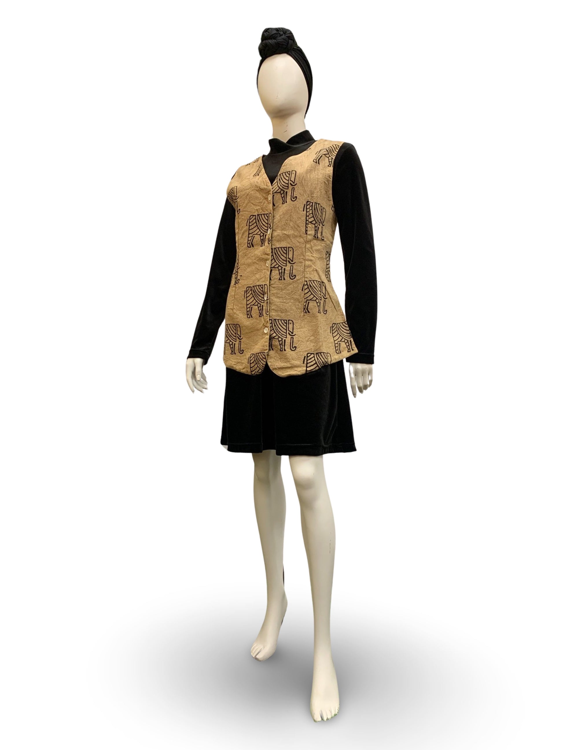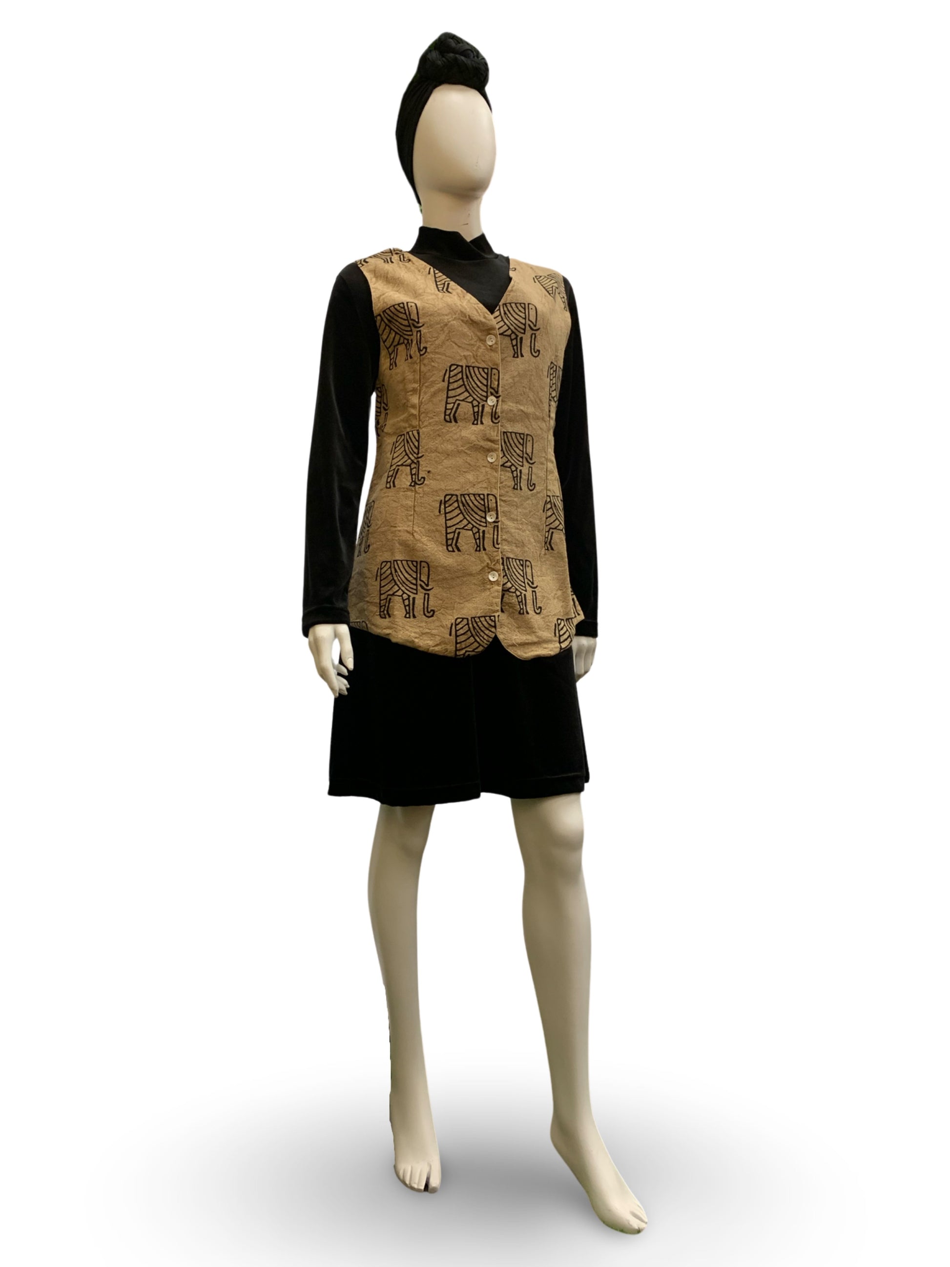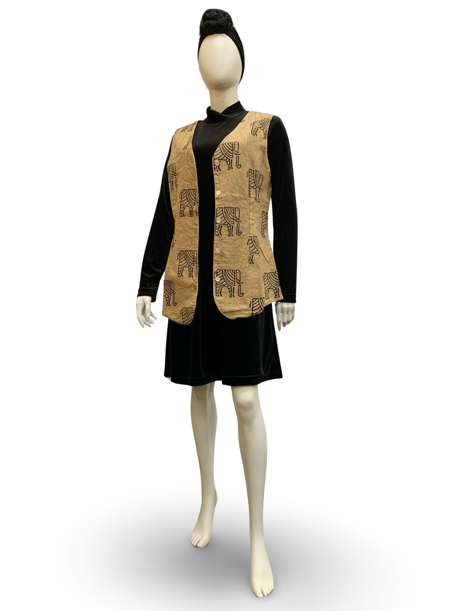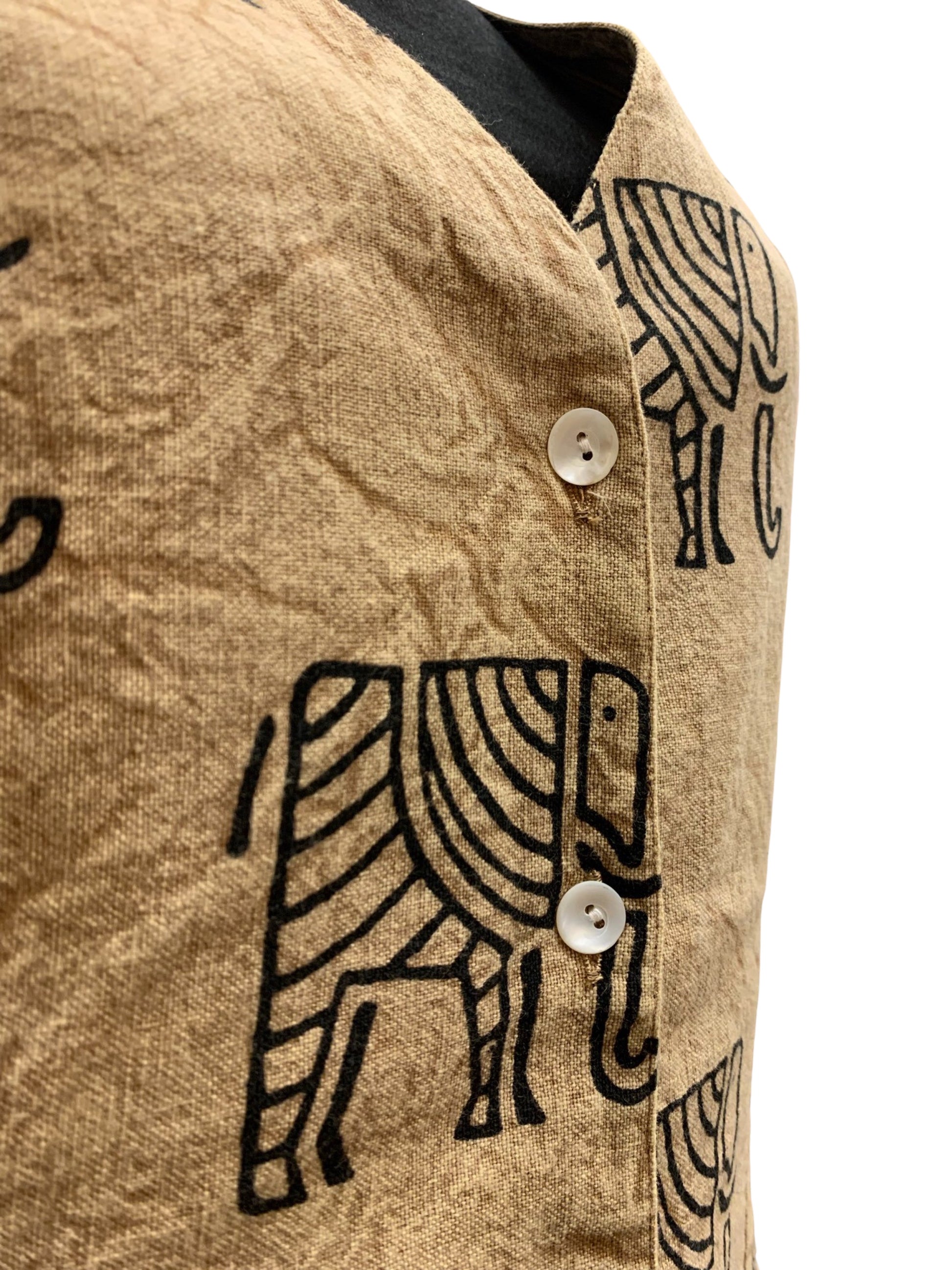 - Sleeveless; no pockets; has wooden buttons; v-neck