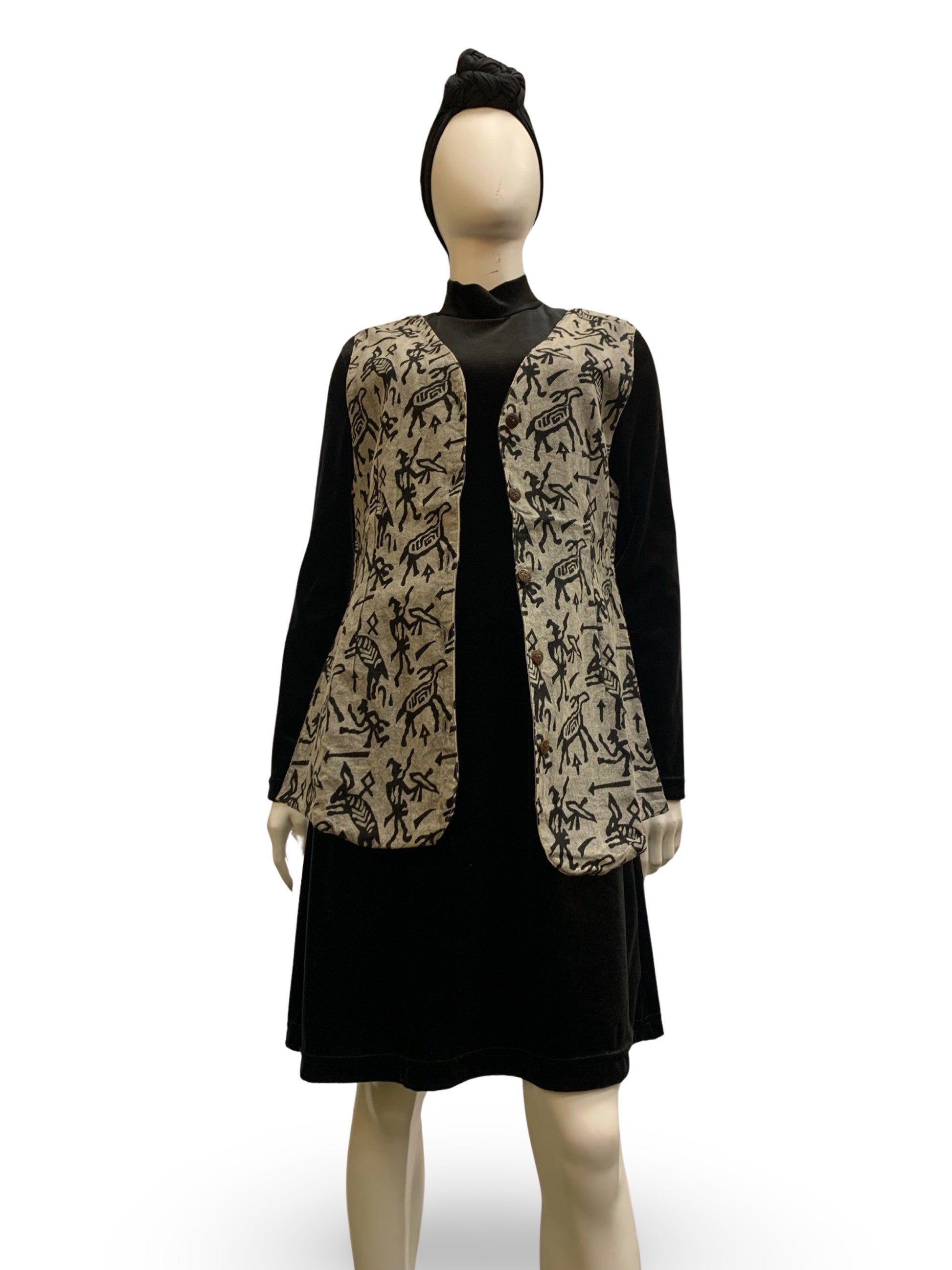 - Sleeveless; no pockets; has wooden buttons; v-neck