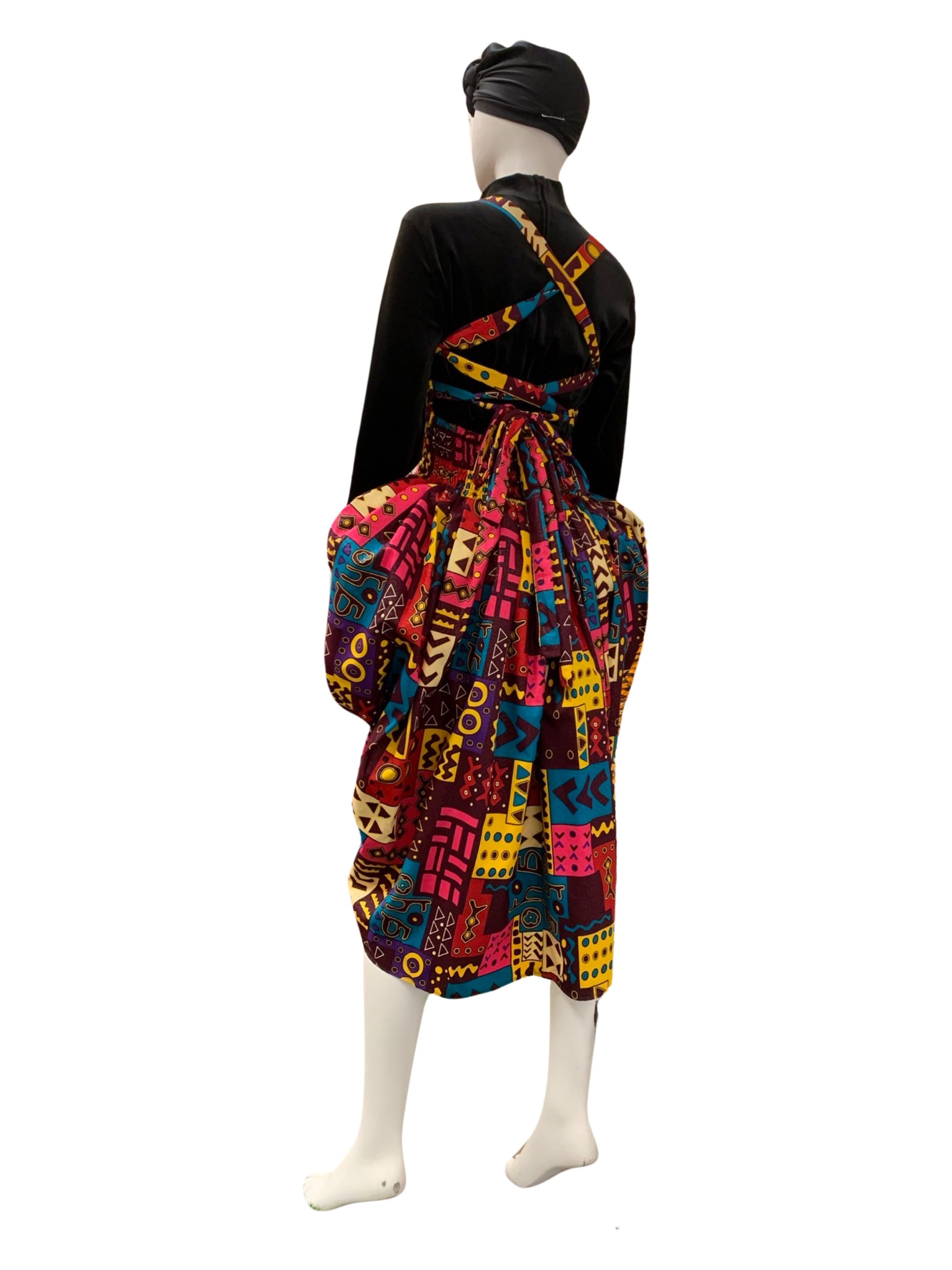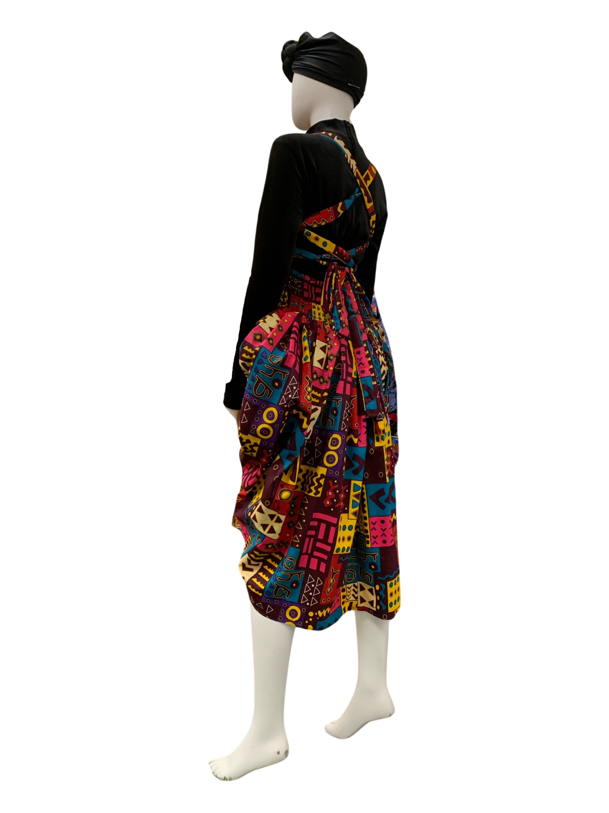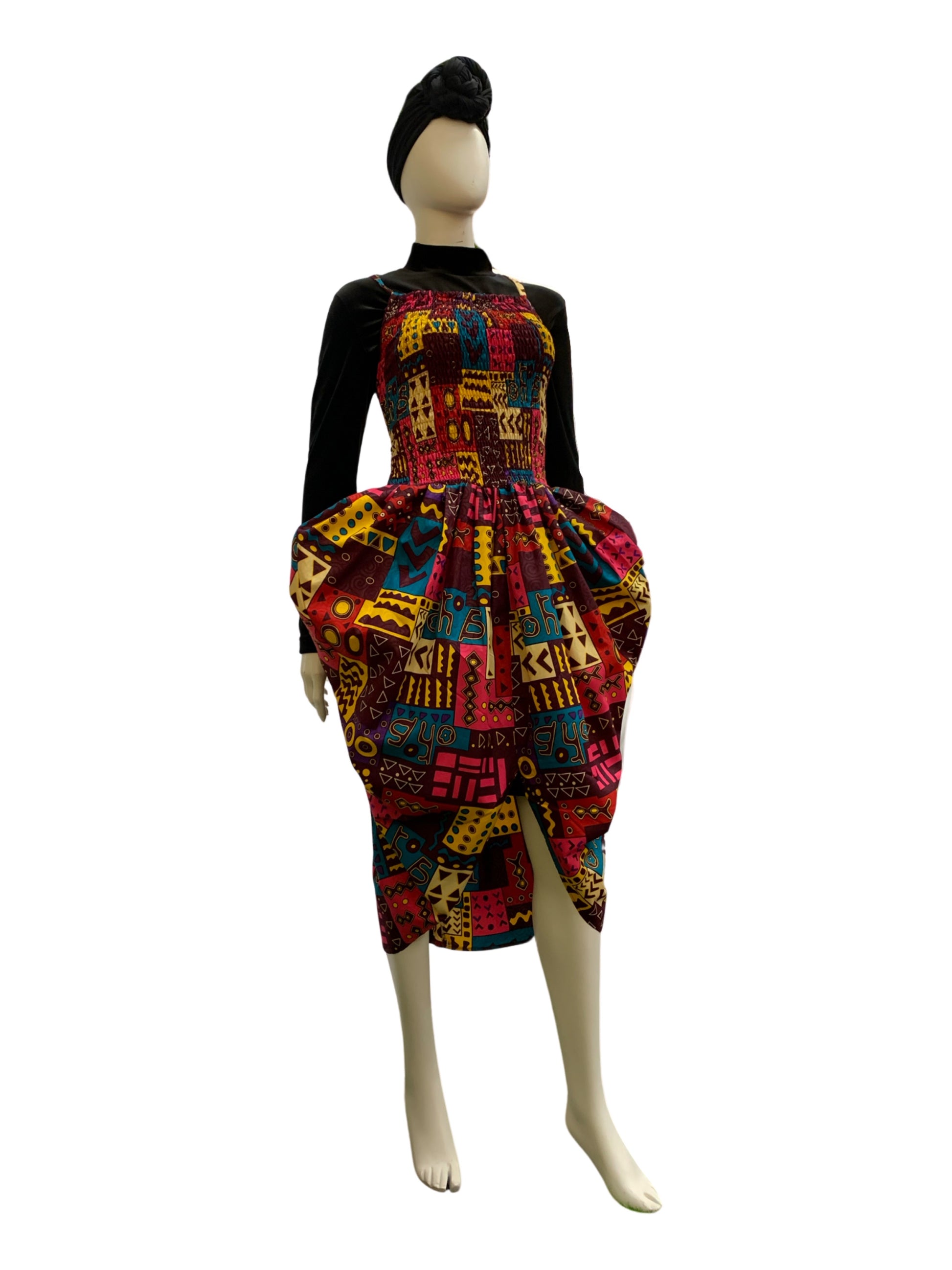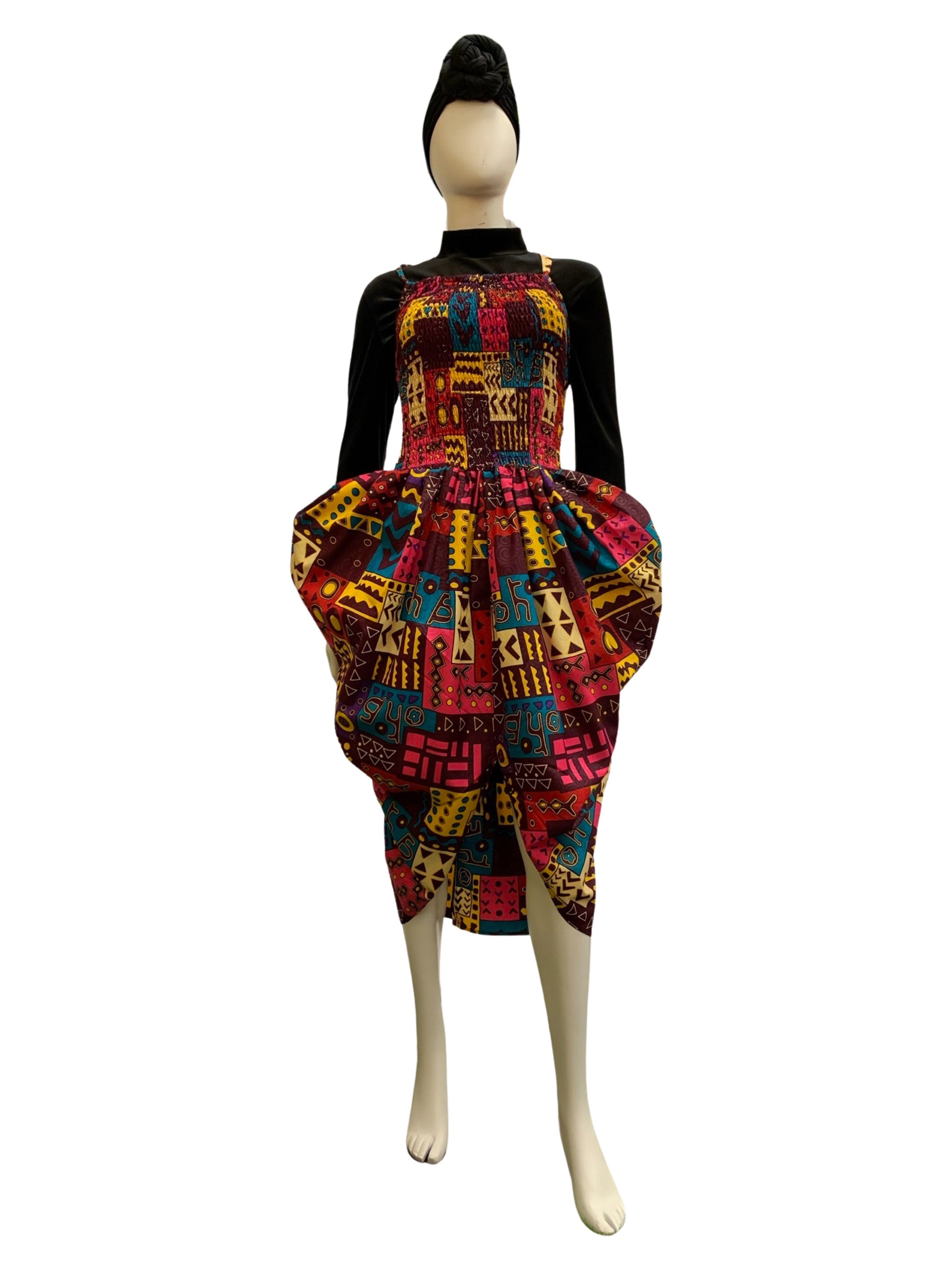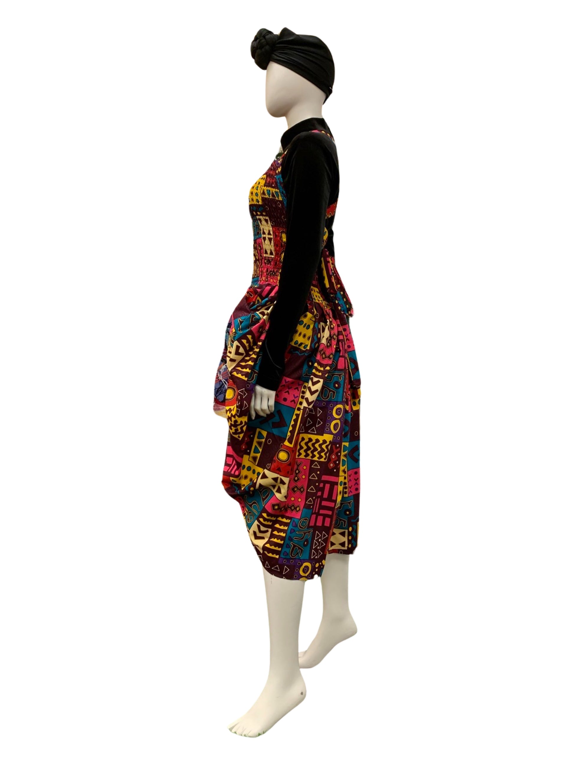 - Sleeveless; has side pockets; doesn’t include a scarf; laced back; elastic bust