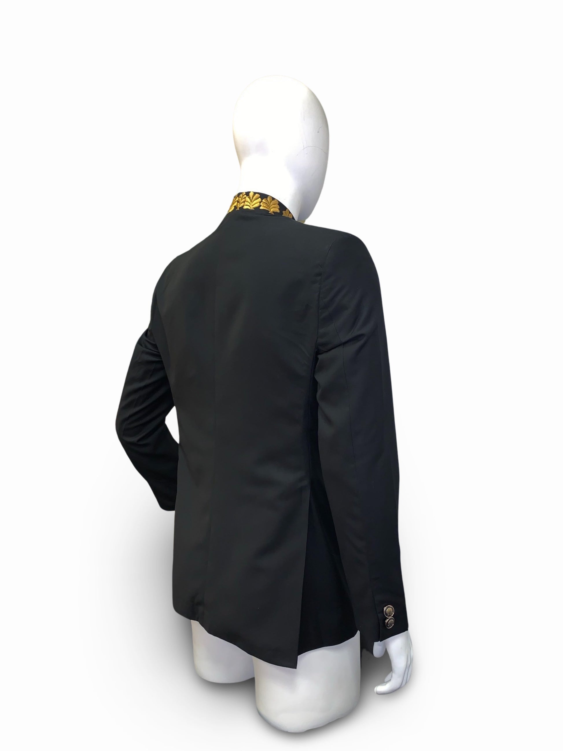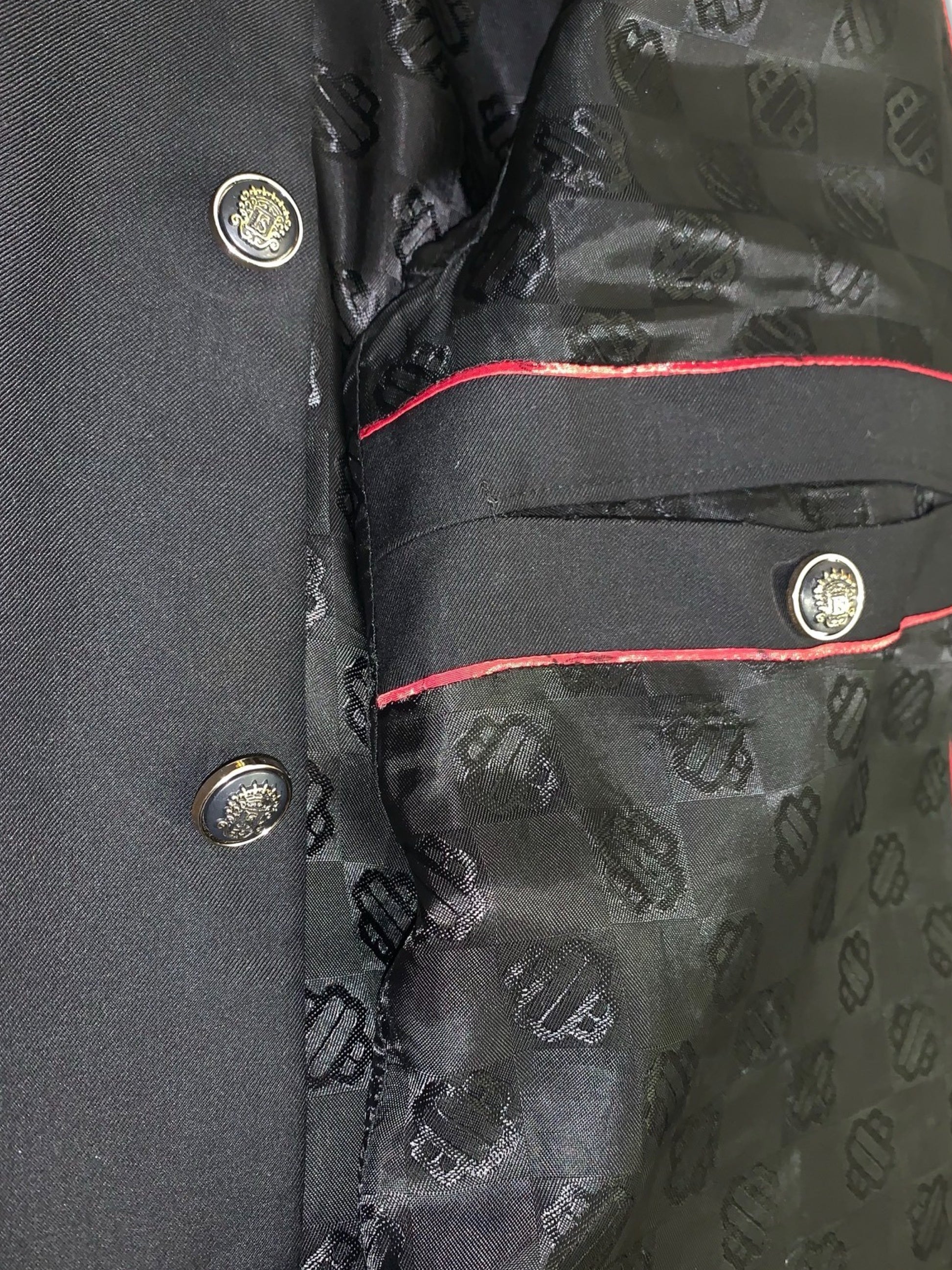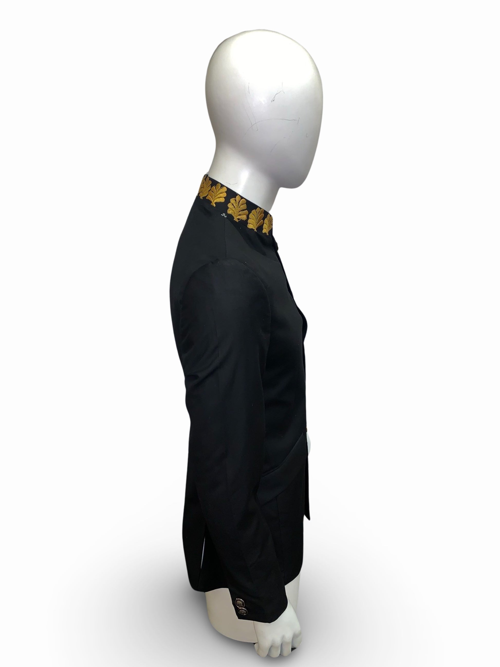 - Button-up; Long sleeve; Front & Inside pockets; Fully lined; Mandarin collar