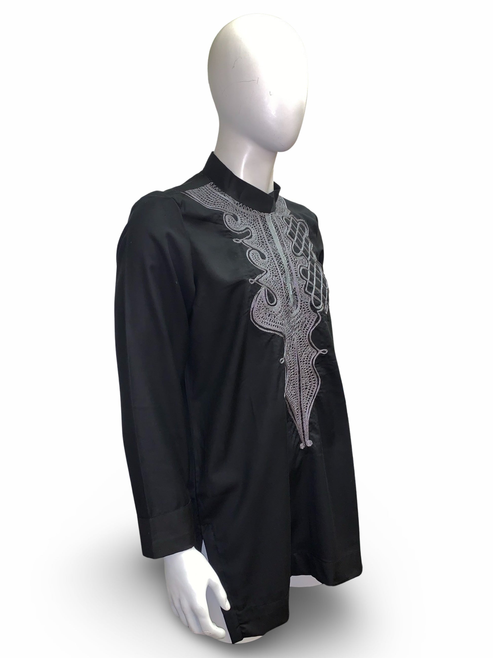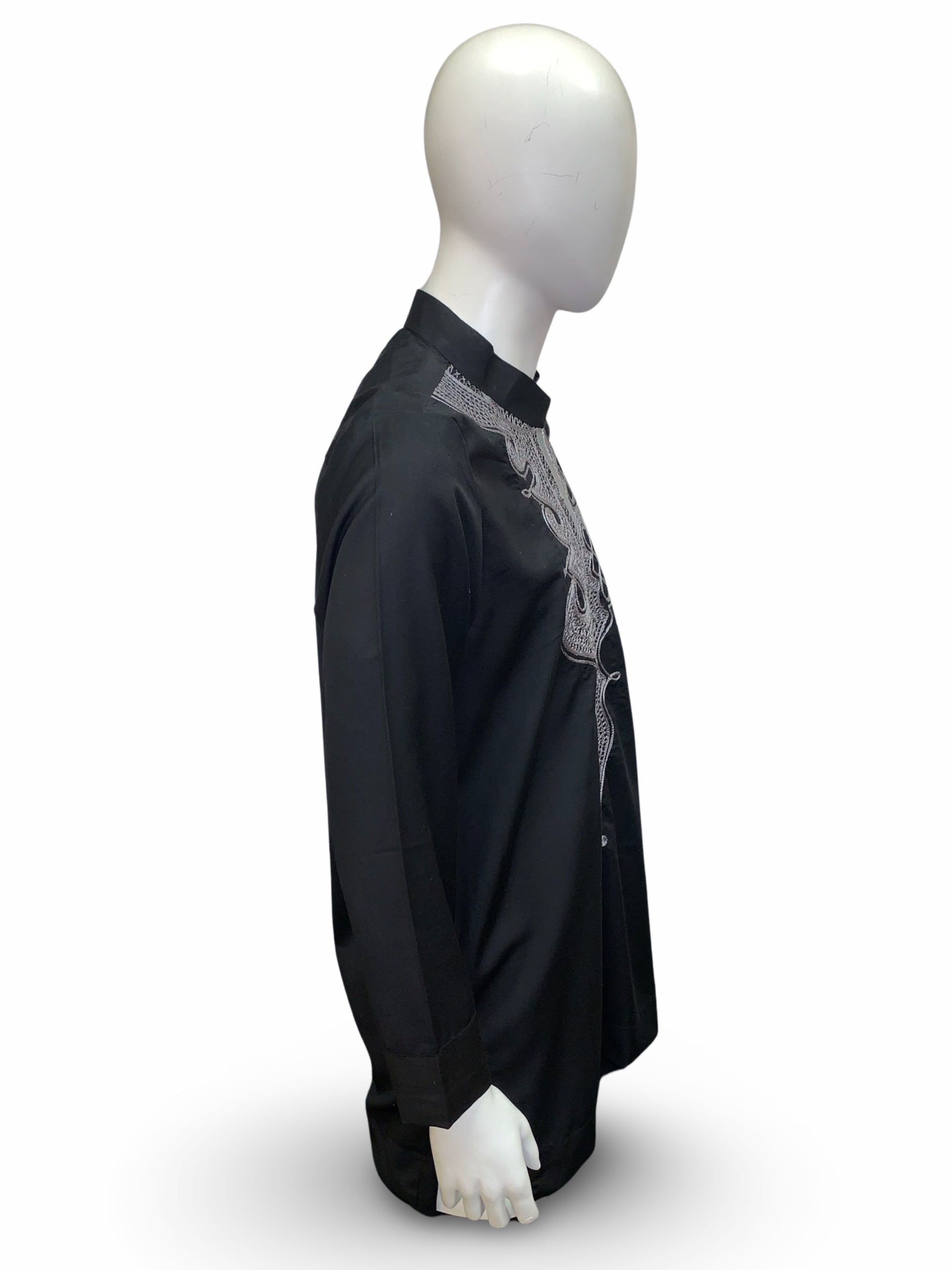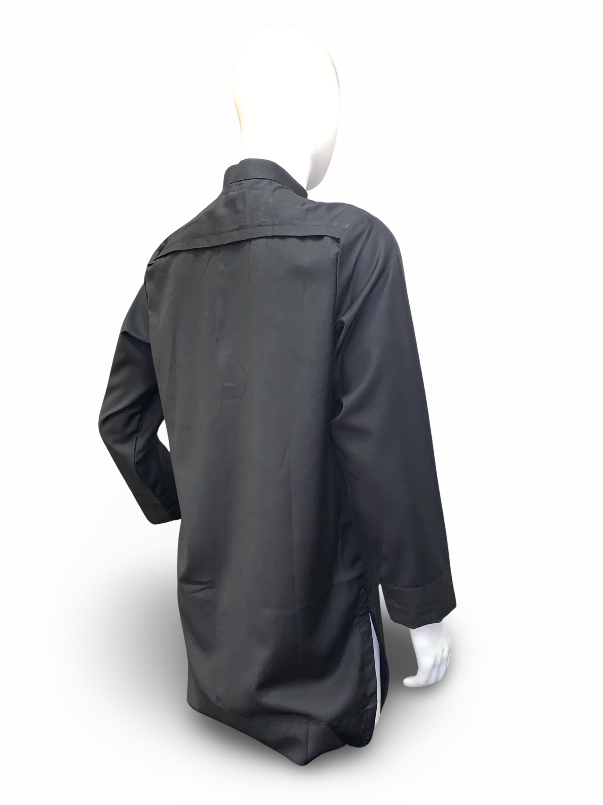 - Long sleeve; No pockets; Hook & eye closure; mandarin collar