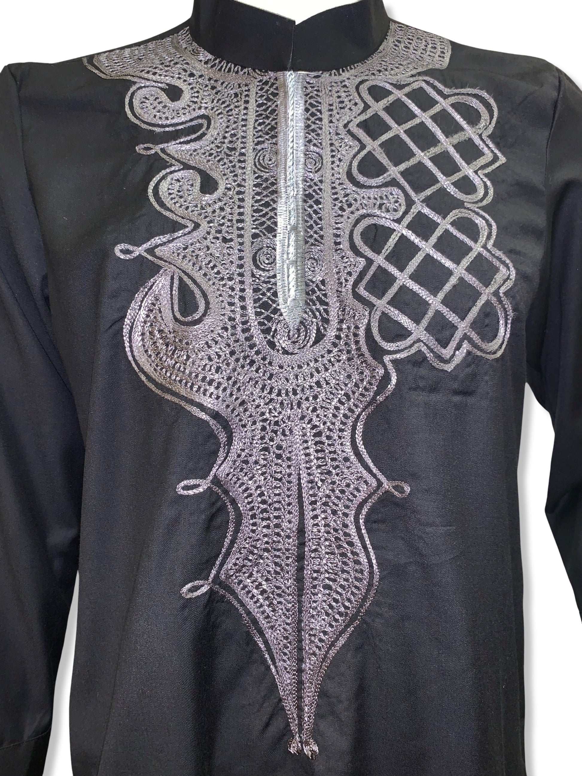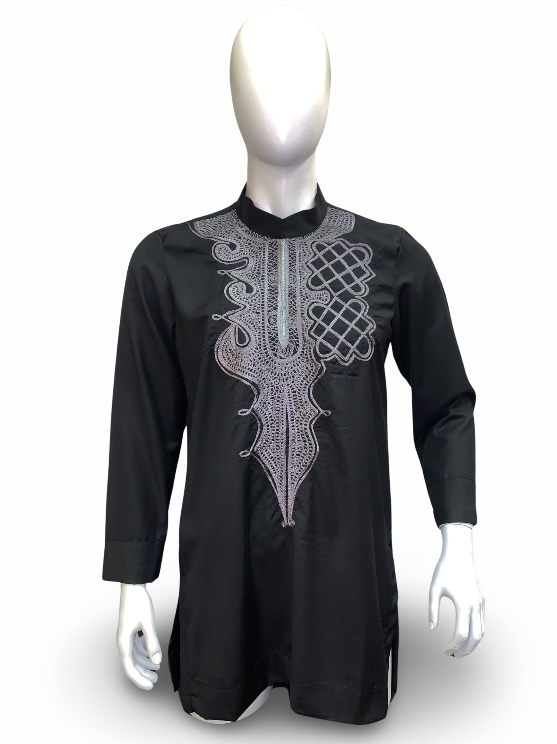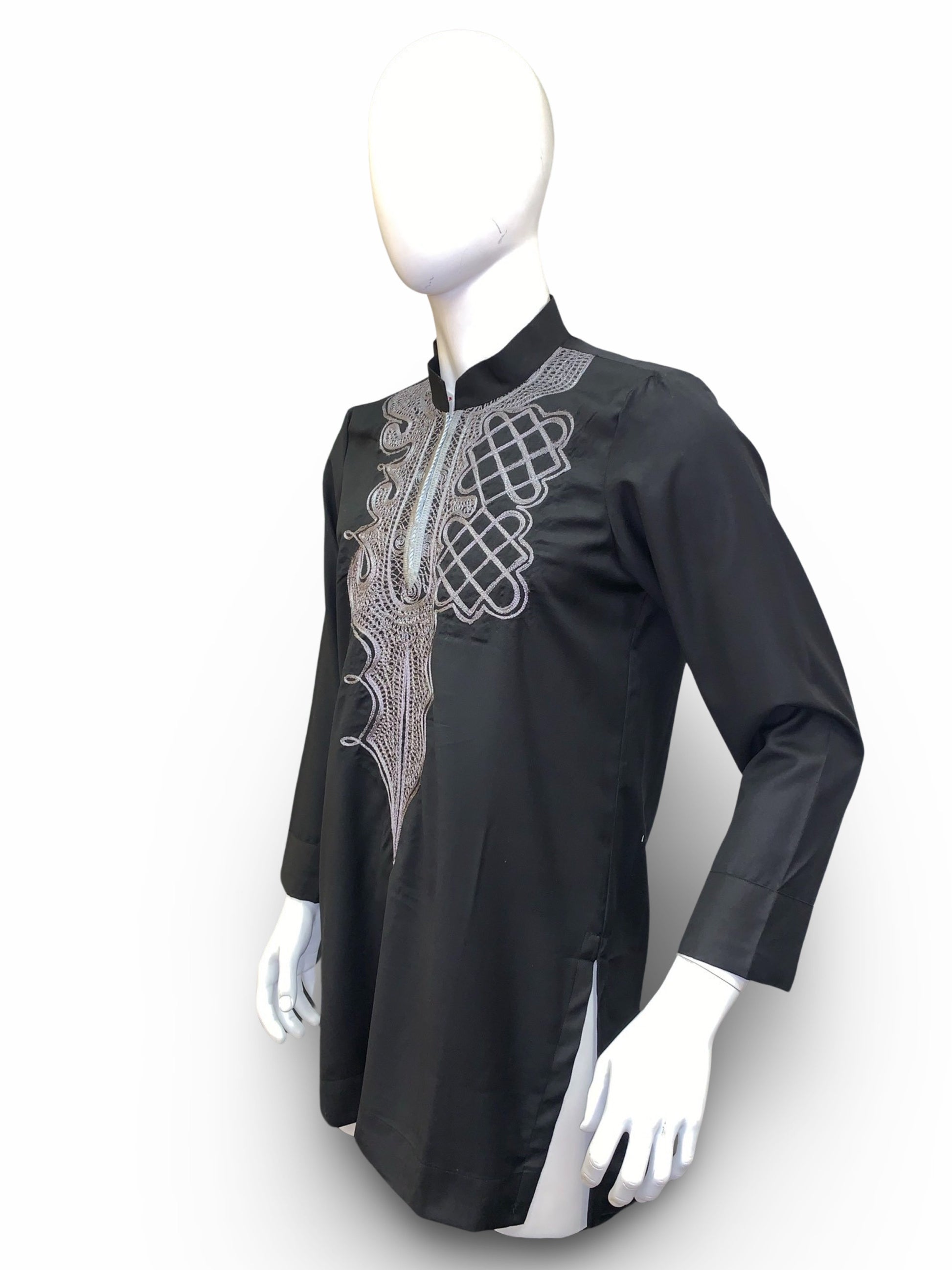 - Long sleeve; No pockets; Hook & eye closure; mandarin collar