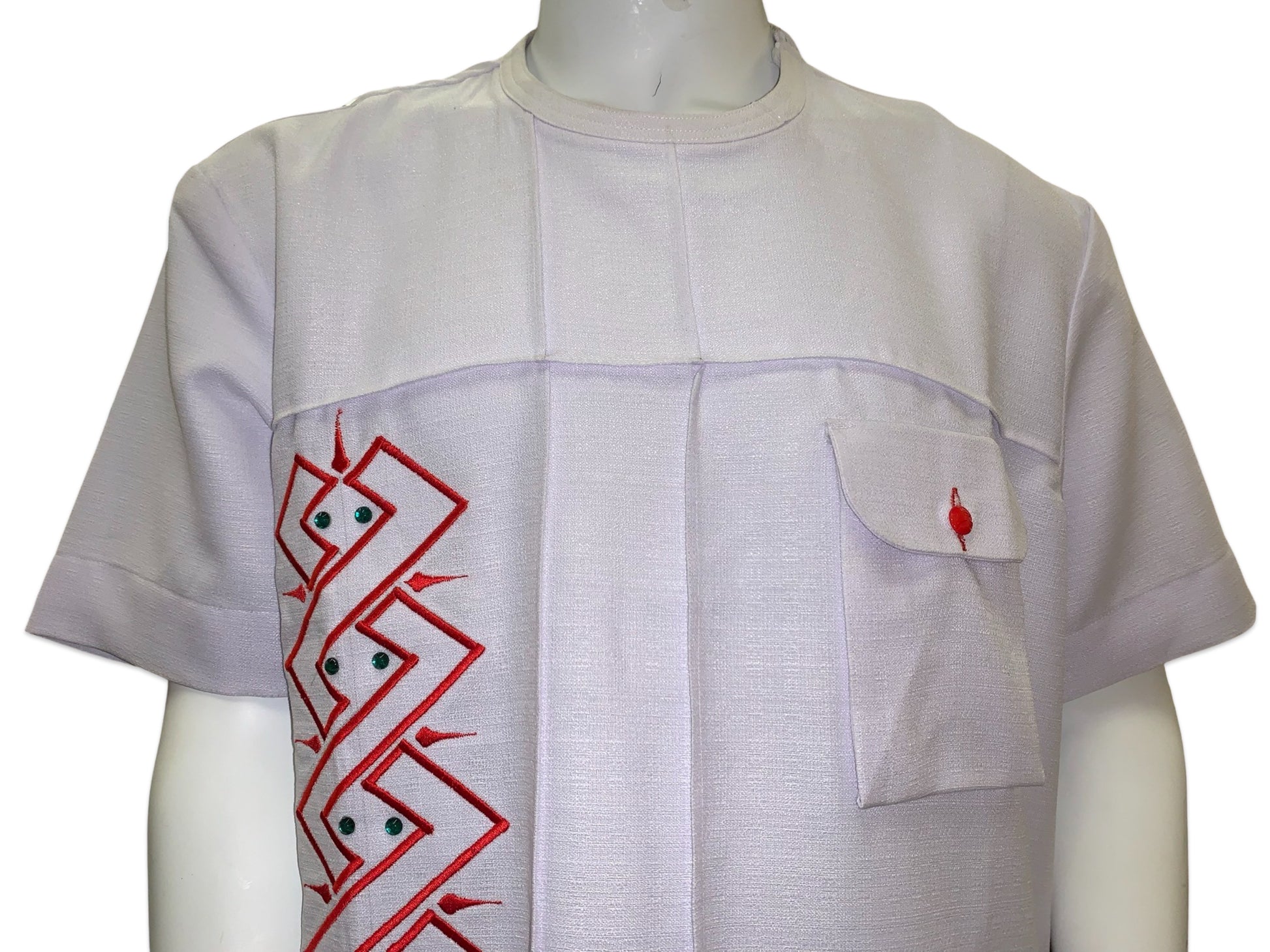 - Color: White w/Red Embroidery